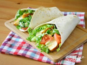 | Krok 5: Na tortille połóż liście sałaty i kurczaka, zawiń |
